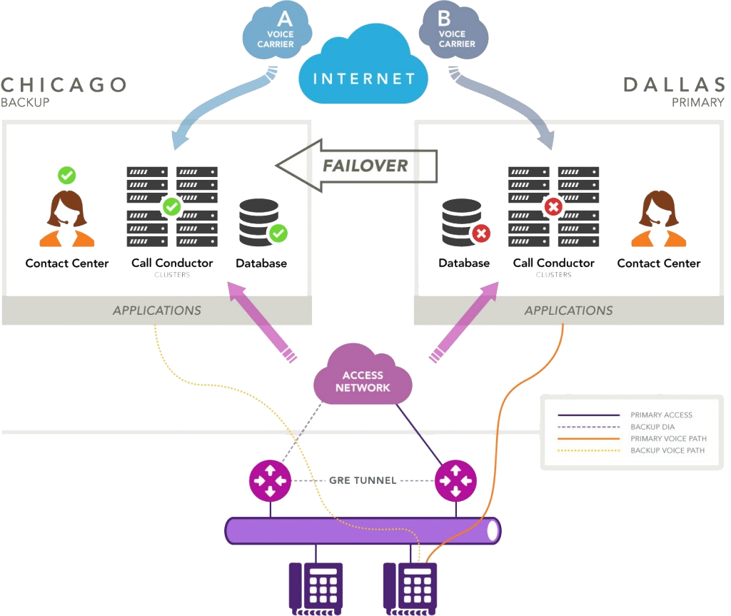 - Connectivity with individual telephone and data carriers that spans multiple locations. If connectivity to one location is lost, calls will be rerouted to another location